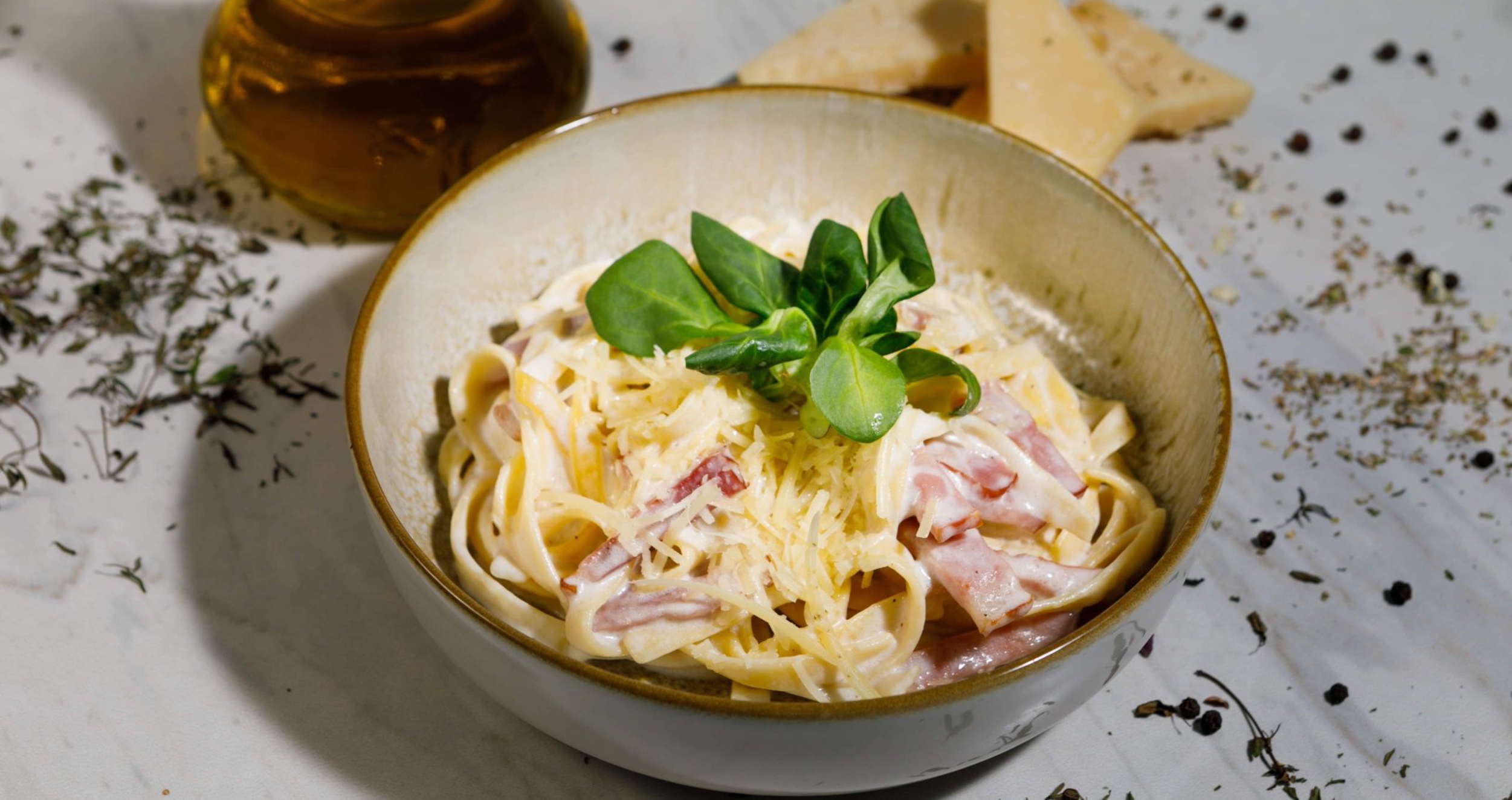 (tagliatelle,bacon, galbenus de ou, parmezan, smantana,sare, piper)