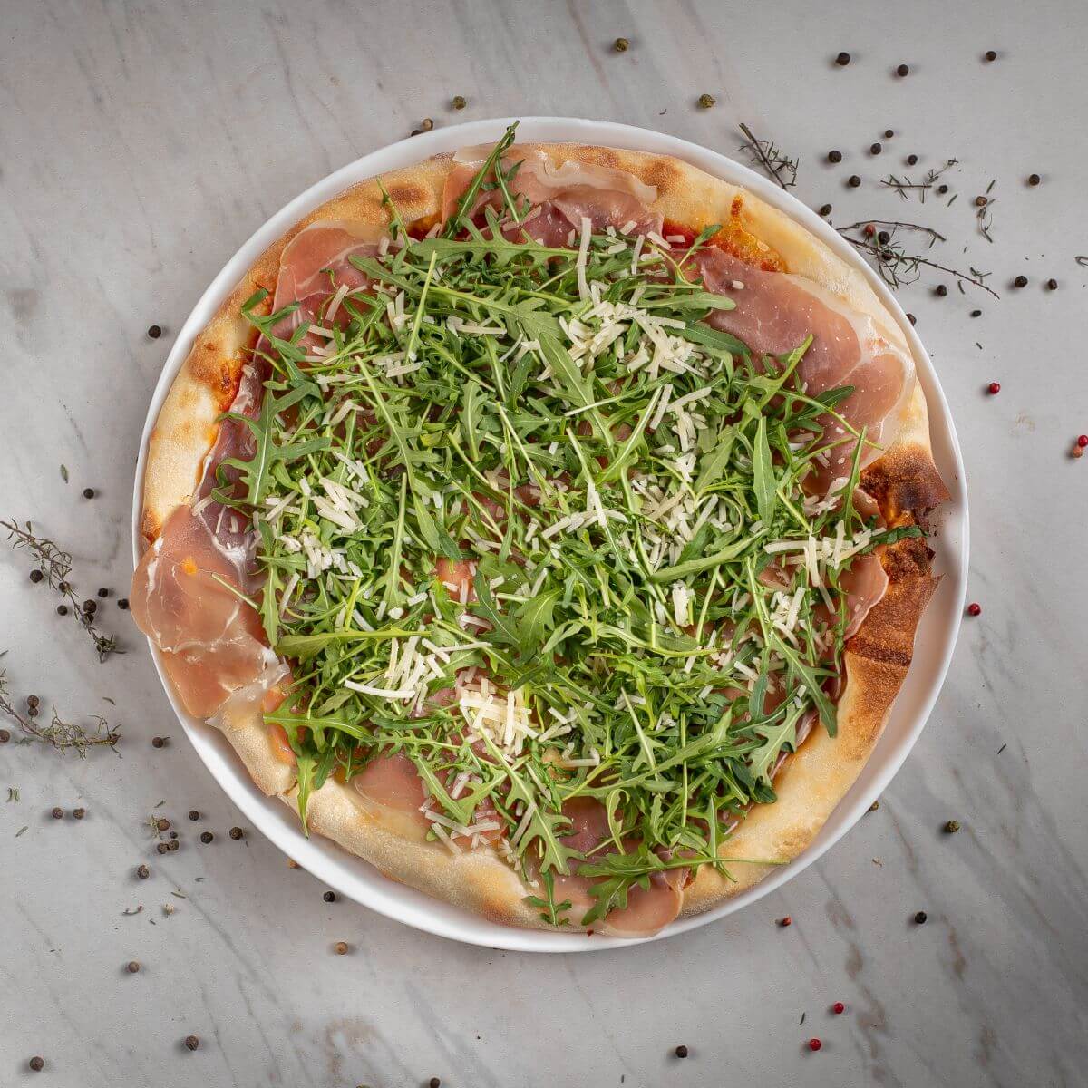 (sos rosii, mozarella, prosciutto crudo, rucola, parmezan) 470G