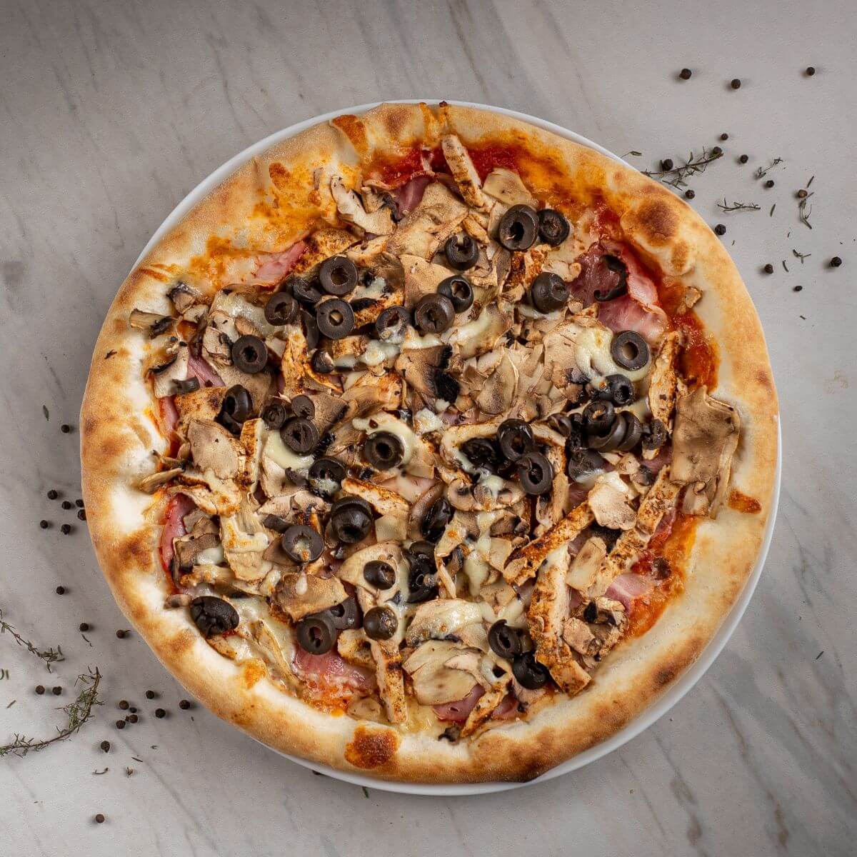 (sos rosii mozzarela, piept de pui la grill, ceafa afumata, ciuperci, masline) 520G